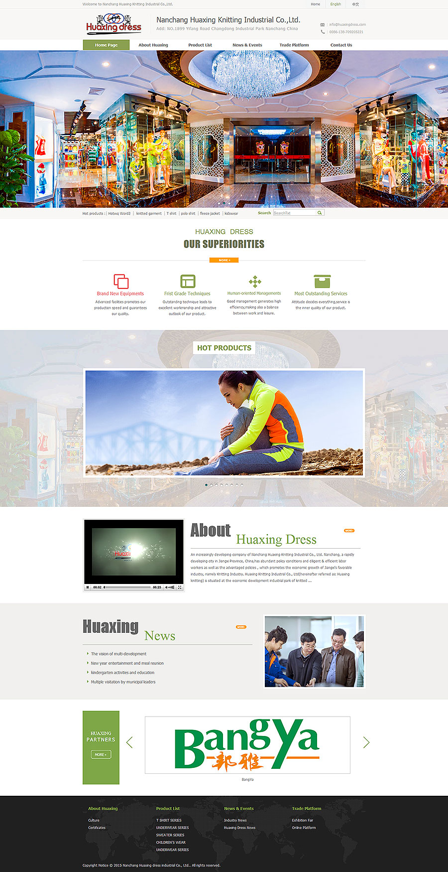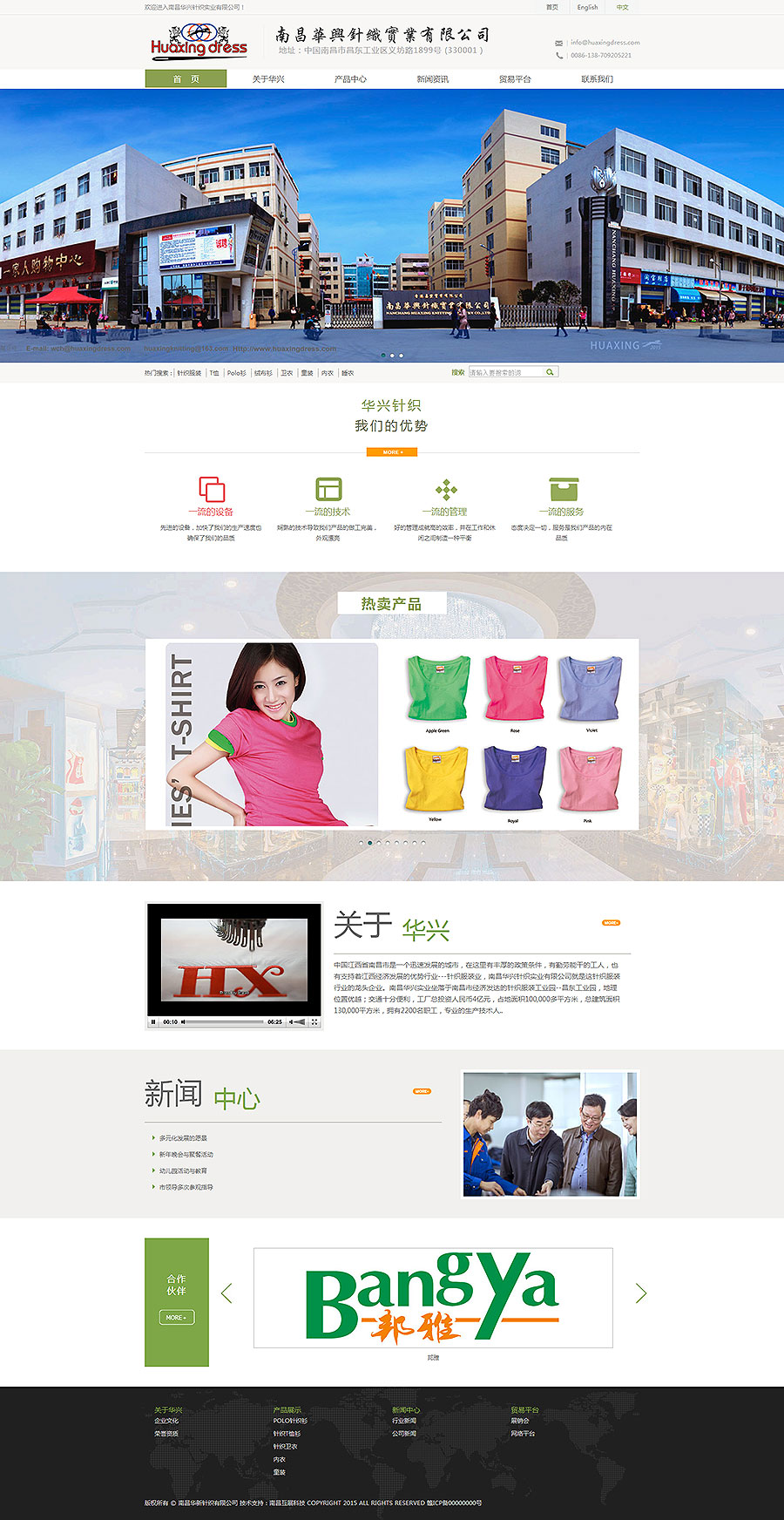 中国江西省南昌市是一个迅速发展的城市,在这里有丰厚的政策条件,有勤劳能干的工人,也有支持着江西经济发展的优势行业---针织服装业,南昌华兴针织实业有限公司就是这针织服装行业的龙头企业。南昌华兴实业坐落于南昌市经济发达的针织服装工业园--昌东工业园,地理位置优越;交通十分便利,工厂总投资人民币4亿元,占地面积100,000多平方米,总建筑面积130,000平方米,拥有2200名职工,专业的生产技术人员160人,8个生产车间,一个大型织布厂,8栋员工宿舍,是一家专业生产针织服装的外贸出口企业,是集设计、开发、生产,销售于一体的服装公司