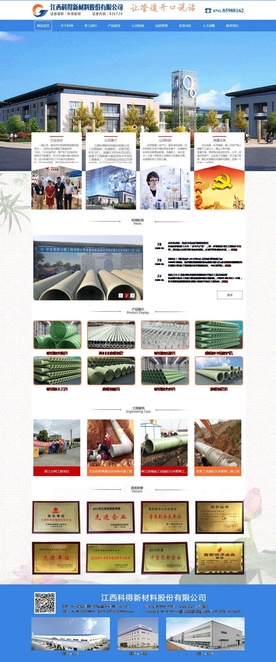 江西科得新材料股份有限公司(证券简称:科得新材,证券代码:836729),创建于2005年2月28日,座落于江西南昌小蓝经济技术开发区(国家级),公司自成立后经过10多年发展,于2016年4月22日在新三板挂牌。目前旗下已拥有两家全资子公司和一家控股子公司,总投资1.55亿元,占地总面积144亩,综合办公楼三栋共7000㎡。 主要产品是玻璃钢夹砂管道、高压管道、通风管道、容器、塔器、一体化智能泵站环保设备以及树脂基复合材料系列产品,为江西省规模最大、品种最全、技术最精、销售额最高、效益最好的高新技术企业。 公司技术力量雄厚,检测和实验设备齐全,拥有60多名专业技术人员,其中中、高级技术职称占70%,共获有国家专利126项。公司是武汉理工大学、南昌大学和华东理工大学的战略伙伴,与其分别建有玻璃钢制品实验基地和研发中心。 公司是江西省玻璃钢行业首家取得输水管、容器二个产品生产许可证和首家通过ISO9001质量管理和三个体系认证的企业。 在行业内,我们是中国复合材料工业协会理事单位,是江西省玻璃钢工业协会会长单位,被评选为南昌市知名商标、江西省著名商标、中国驰名商标和